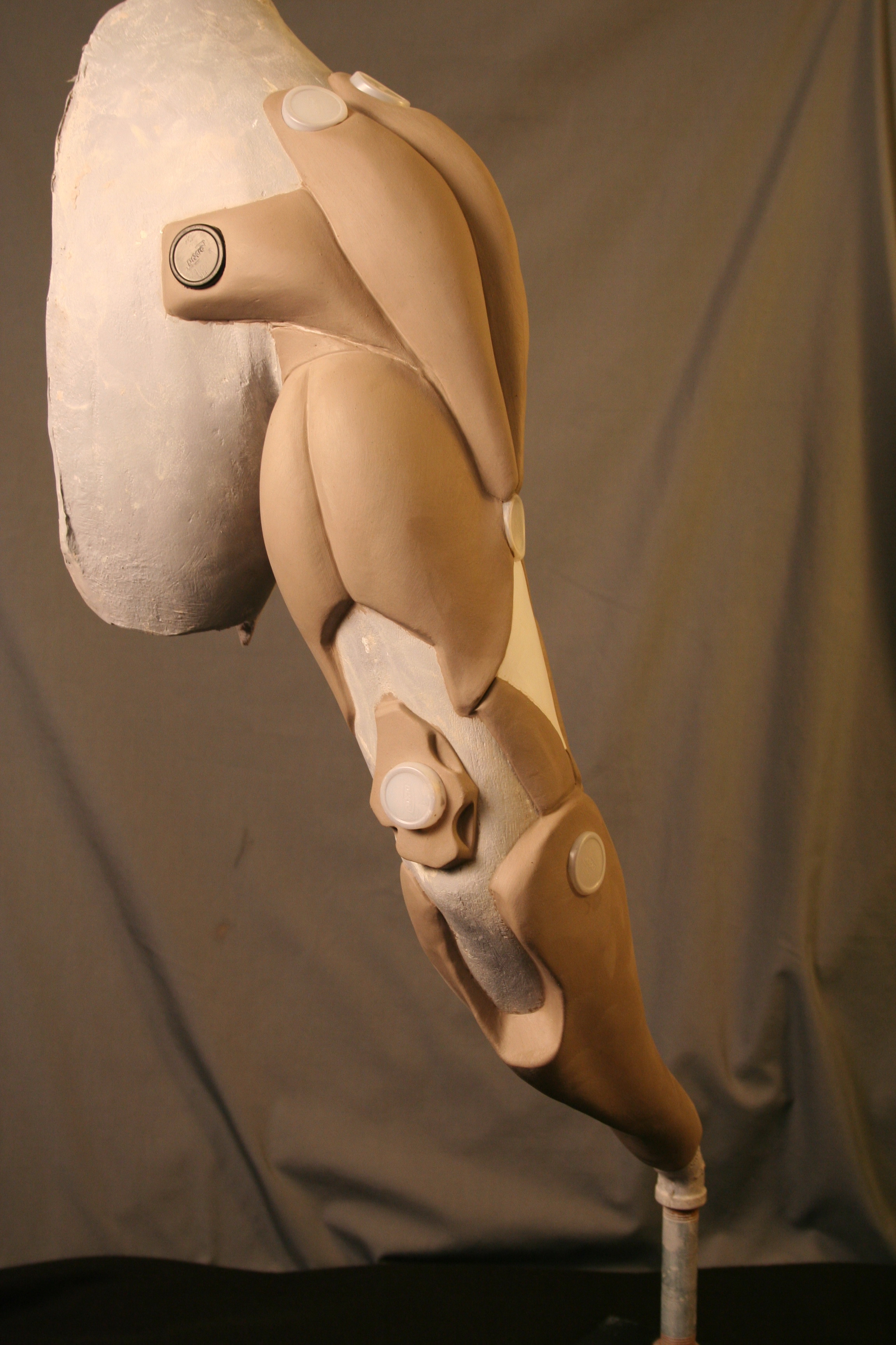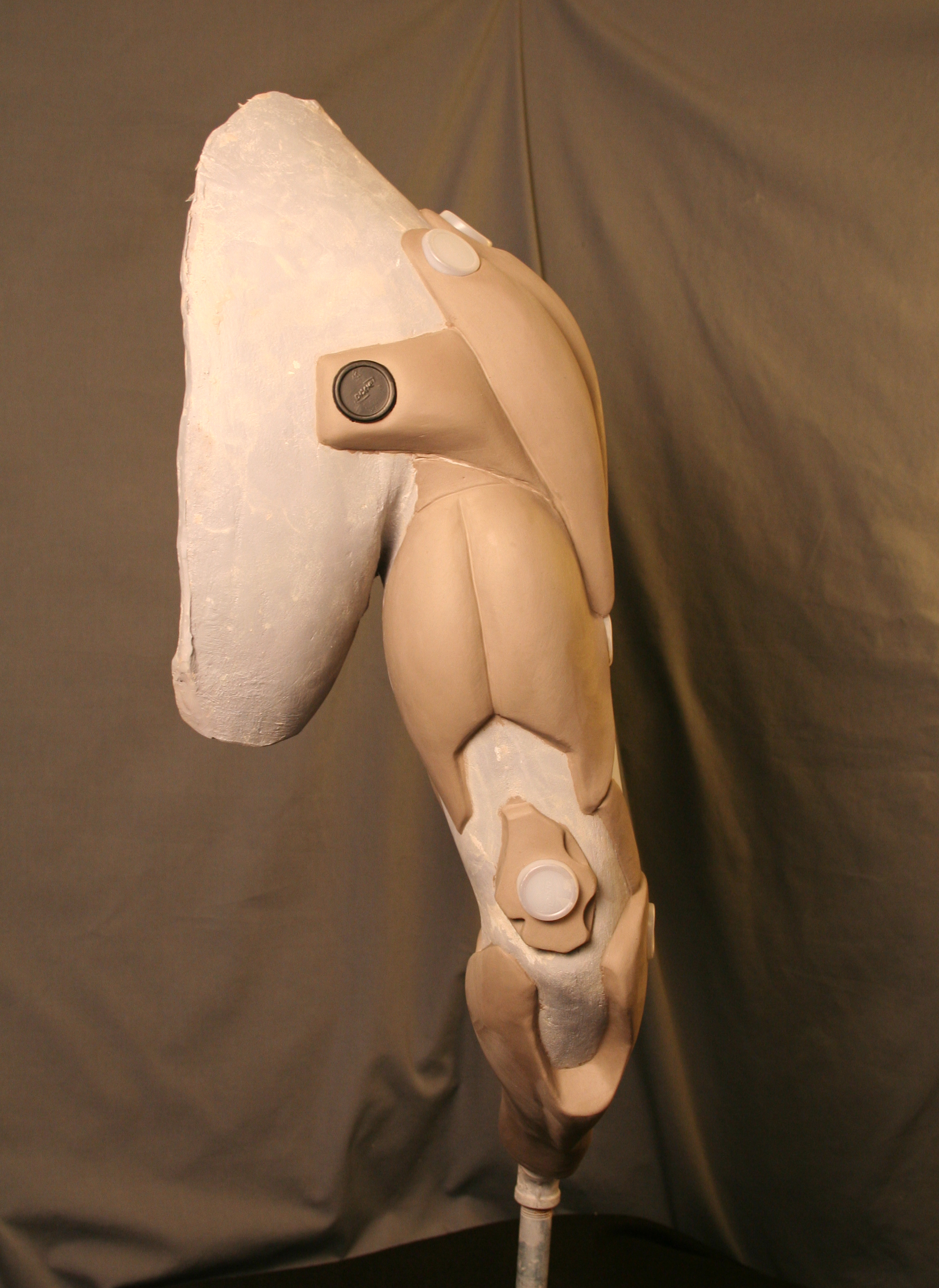 The plan was likely to do silicon prosthetics, glue them to the arm, and paint the arm and all as appropriate or possibly gluing the pieces to a slim form fitting sleeve the could be slipped on to the arm.